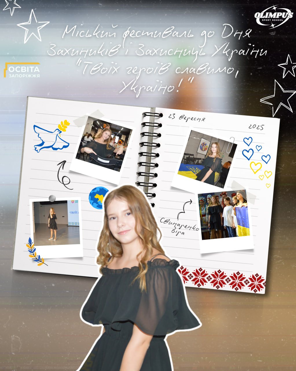 Ми щиро вітаємо нашу талановиту ученицю 8-А класу Запорізької спеціалізованої школи фізичної культури №18 та активну учасницю учнівського самоврядування «Олімпус» – Свинаренко Віру.